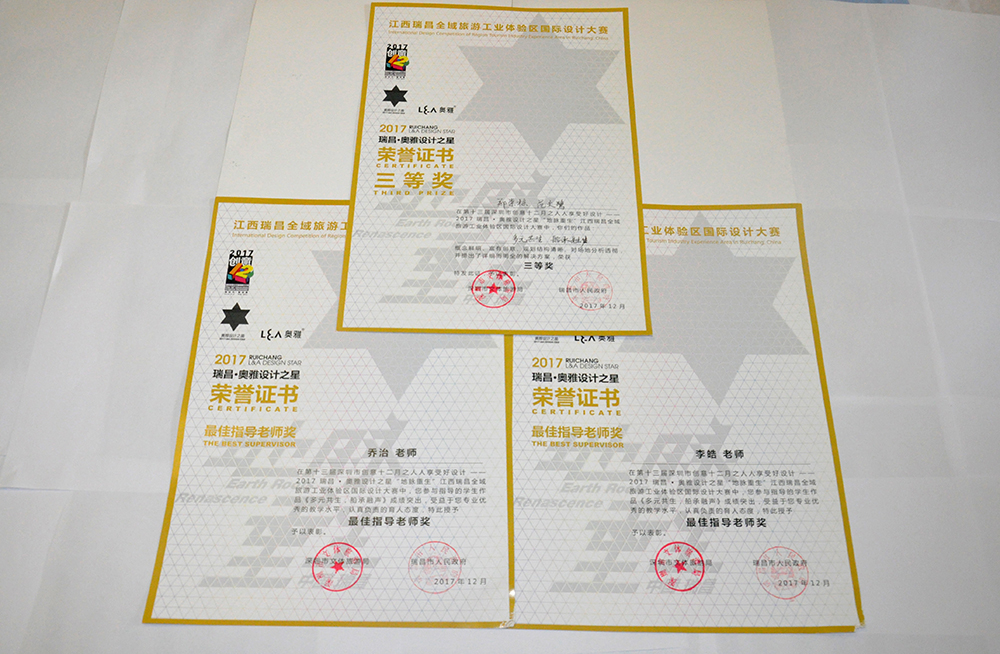 12月23日,在 2017瑞昌•奥雅设计之星国际高校设计大赛颁奖典礼暨“地脉重生”工业遗产开发与全域化工业旅游发展高峰论坛,由公司环境设计系乔治、李皓老师指导的本科四年级员工郑崇栋、范文鹭设计作品《多元共生,船承融声》,在本次竞赛中荣获三等奖,奖金10000元。公司环境设计系乔治、李皓教师荣获本次竞赛优秀指导教师奖。两名获奖同学及指导教师李皓老师受邀共同到达江西瑞昌论坛现场对其作品进行了讲解。