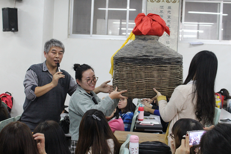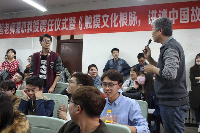 王智老师接受聘书后走到同学们中间:“我很乐意成为大家心中的教授,我希望能够把草根讲台深入到每一位同学的心中,我希望在学校给予的平台上,我们共同完成一种非遗深度进校园的实践。”