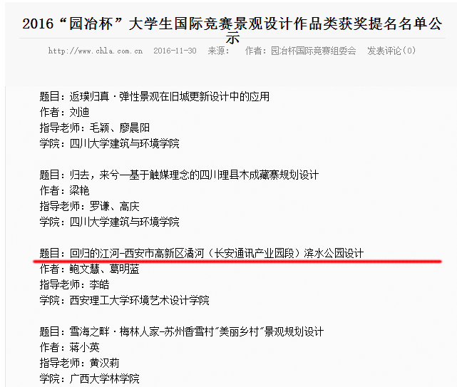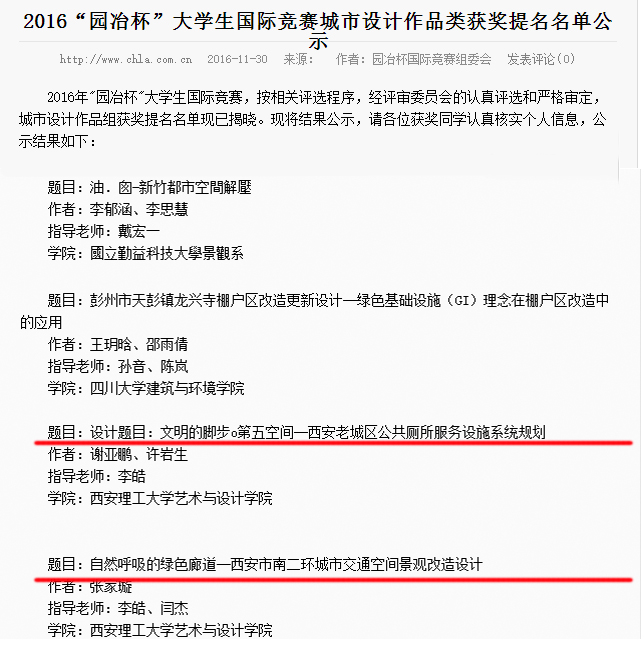 11月30日,2016年“园冶杯”老员工国际竞赛,按相关评选程序,经评审委员会的认真评选和严格审定,城市设计作品组、景观设计作品类获奖提名名单现已揭晓,由公司suncitygroup太阳集团网站环境设计系李皓老师、闫杰老师指导的员工谢亚鹏、许岩生设计作品《文明的脚步•第五空间——西安老城区公共厕所服务设施系统规划》、员工张家璇设计作品《自然呼吸的绿色廊道——西安市南二环城市交通空间景观改造设计》,员工鲍文慧、葛明蓝设计作品《回归的江河——西安市高新区潏河(长安通讯产业园段)滨水公园设计》,这三组作品成功入围城市设计作品组和景观设计作品类获奖提名名单,并最终于12月初角逐前三等奖。