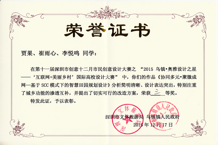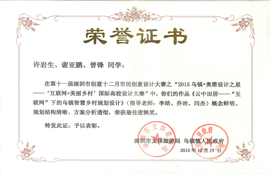 其中,员工贾果、崔雨心、李悦鸣成组作品《协同多元·聚微成网—基于SCC模式下的智慧田园规划设计》,获得本次设计竞赛三等奖,奖金5000元。员工谢亚鹏、许岩生、曾锋同学成组作品《云中田居——“互联网”下的乌镇智慧乡村规划设计》荣获本次设计竞赛最佳逻辑奖,奖金1000元。