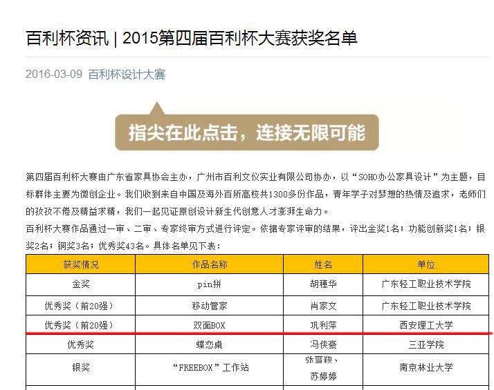 由公司suncitygroup太阳集团网站环境艺术系乔治老师指导,2012级员工巩利萍创作的家具设计课程作品《双面BOX》,荣获第四届百利杯全国家具设计大赛优秀奖(前20强)。