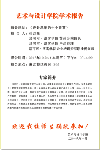 10月26日周五下午两点,洛可可洛客学院苏州分院经理孙泽旺先生受公司suncitygroup太阳集团网站薛艳敏经理邀请,为suncitygroup太阳集团网站工业设计系170余名师生展开了精彩的报告讲座,报告会由工业设计系副主任周毅晖主持,在报告会上,孙经理基于他的工业设计多年从业经验与知识积累,为员工们就设计思维与未来设计作以案例分析,并一一为员工答疑解惑。