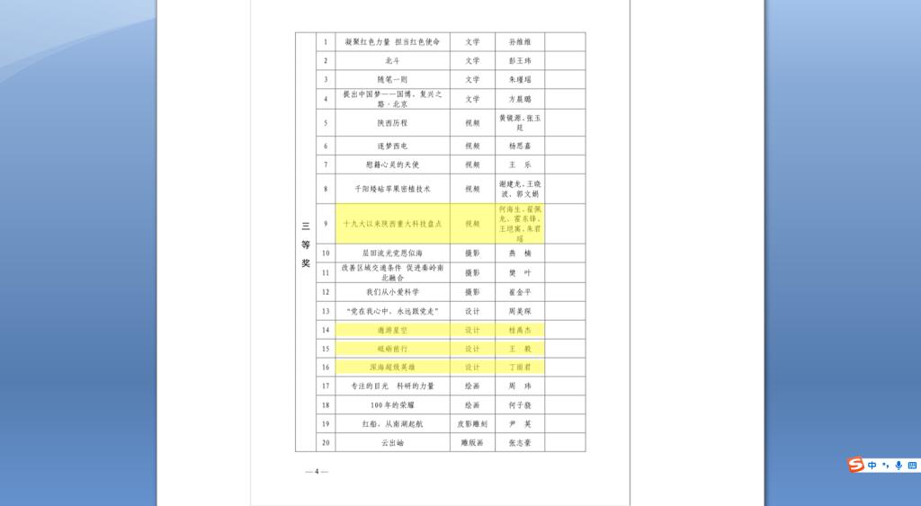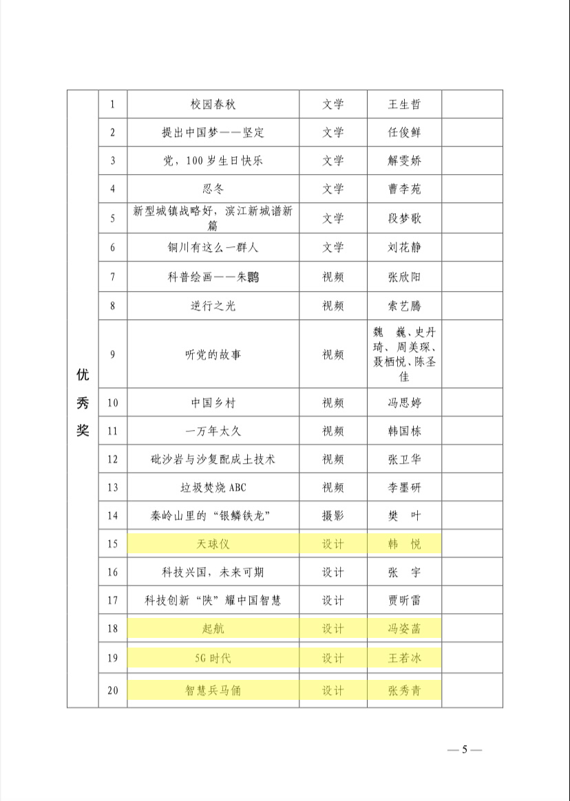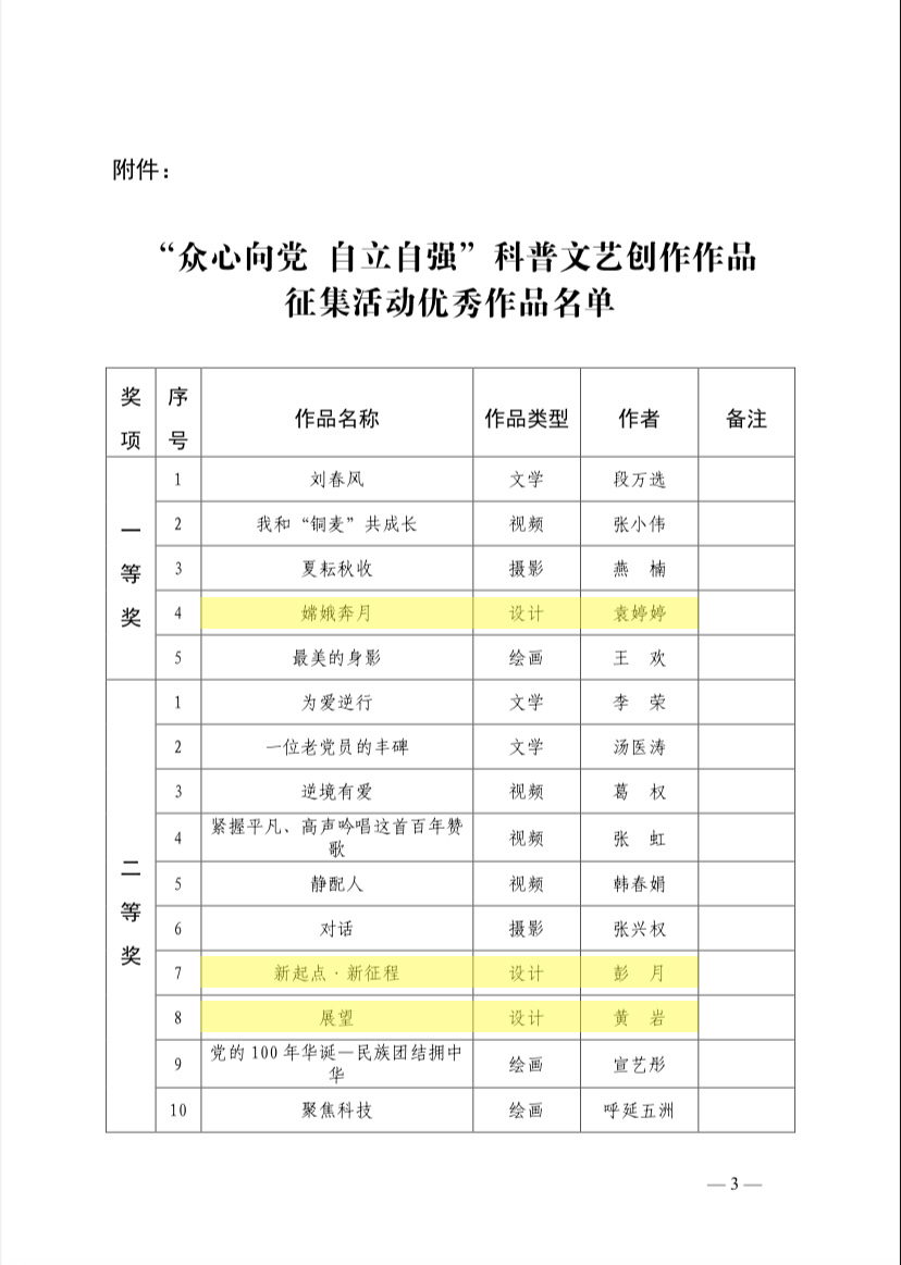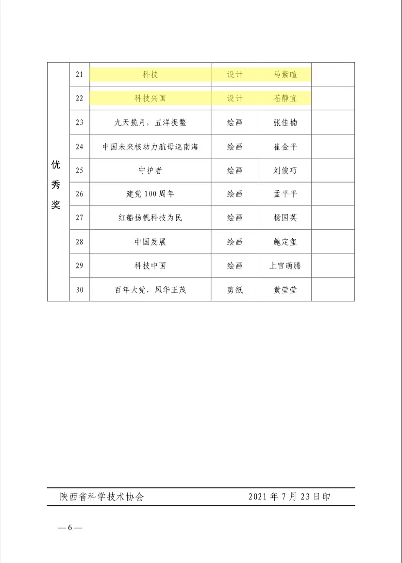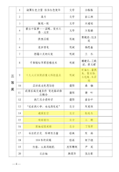 为庆祝中国共产党成立100周年,弘扬中国科学家精神,讴歌百年巨变、见证陕西辉煌,由陕西省科学技术协会主办、陕西省科普作家协会承办的此次科普文艺创作征集活动历时近半年,经过专家初评、集中评审,共评选出优秀作品65件(组、幅),其中一等奖5件(组、幅)、二等奖10件(组、幅)、三等奖20件(组、 幅)、优秀奖 30 件(组、幅)。