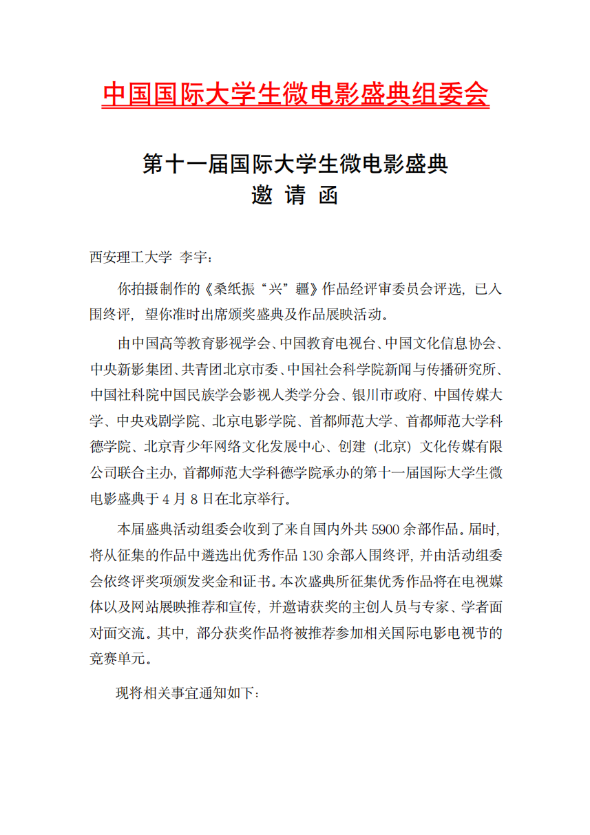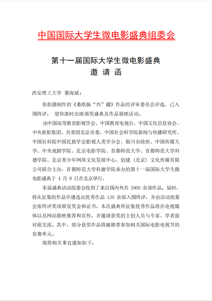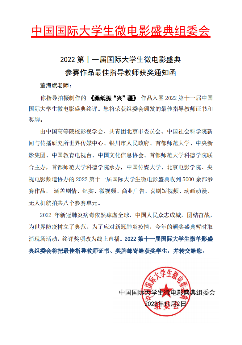 紧随时代脉搏,传递社会正能量。近日,由中国高等院校影视学会、共青团北京市委员会、中国社会科学院新闻与传播研究所世界传媒中心、银川市人民政府、首都师范大学、中央新影集团、中国教育电视台、中国文化信息协会、首都师范大学科德学院联合主办,首都师范大学科德学院承办,中国传媒大学、北京电影学院、央视电影频道协办的2022第十一届中国国际老员工微电影盛典终定于2023年4月8日在北京举行。由公司suncitygroup太阳集团网站影像动画系董海斌副教授带领员工李宇、高毅拍摄制作的《桑纸振“兴”疆》作品,经初评委员会评选,该作品已入围终评,董海斌副教授获“最佳指导教师”奖项。