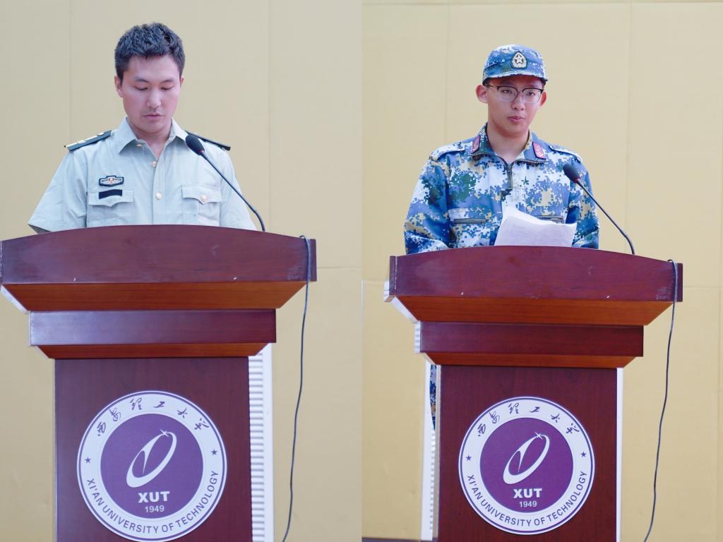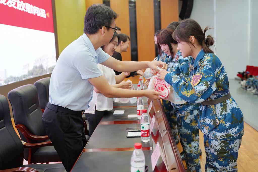 指导员李铮铮做军训工作汇报,李松昊代表2023级本科生发言。随后,学院领导分别为军训教官、指导员和员工代表发放了慰问品。