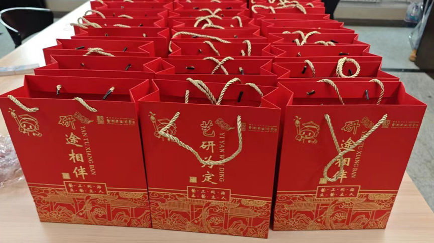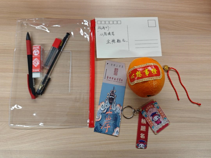 公司为考研学子精心准备了70余份礼包:孔庙祈福考研文具套装代表着“装备齐全,整装待发”;橙子代表着“心想事成”;上岸书签寓意着“成功上岸”;绘有学院IP形象“艺果果”的钥匙链代表着“金榜题名”;祝福贺卡上写满了老师和学弟学妹们对考研学子真挚的期盼与祝愿······