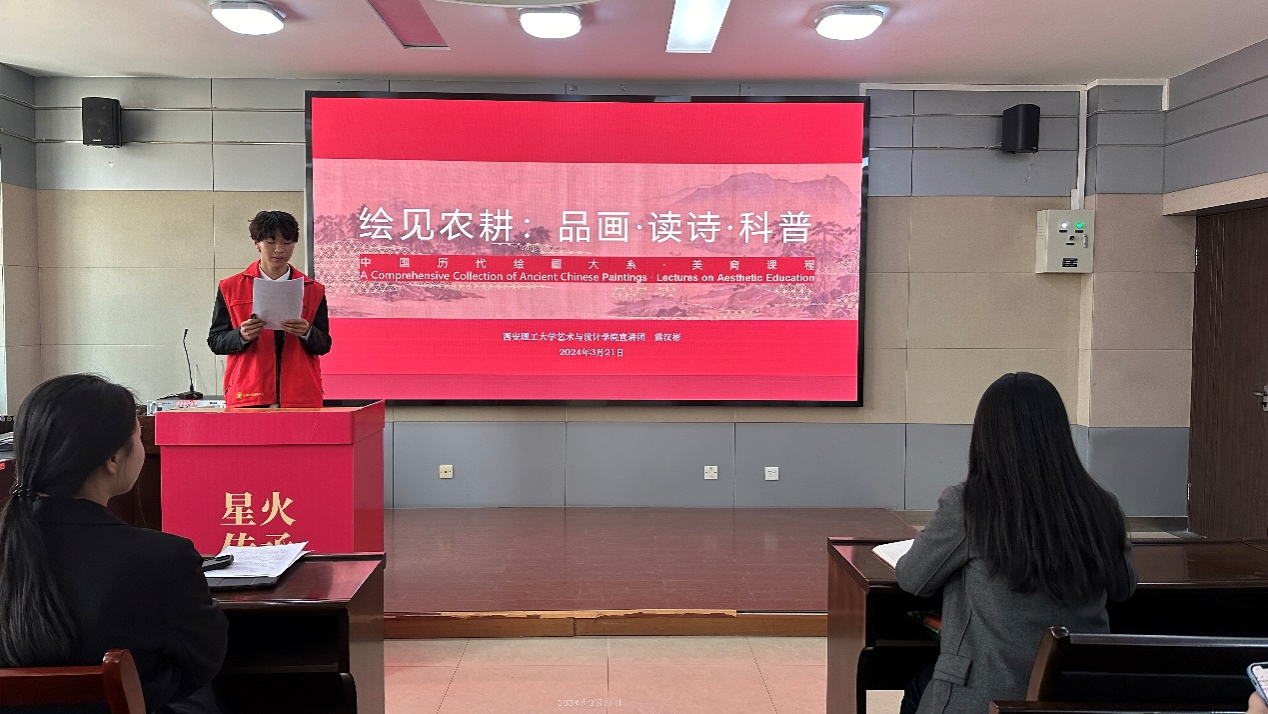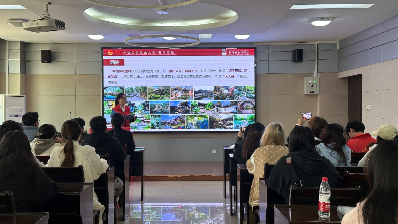 培训中,徐睿以中国历代绘画中的园林文化为主题,分析了中国园林“虽由人作,宛自天开”的艺术特色和文化内涵,在赏画中品园,在品园中明理立德。熊汉彬以农耕文化为主题,带领同学们一起品画、读诗、聊科学,在中国古代绘画中“绘见”农耕文化,解译中华民族文明密码。宣讲结束后,赵婷就此次培训进行了总结发言,她提出,作为艺设学子更应该发挥自己的专业所长,传承和弘扬好中华优秀传统文化,增强对中国式现代化道路和人类文明新形态的理解,提升文化素养,争做社会主义核心价值观的模范践行者。