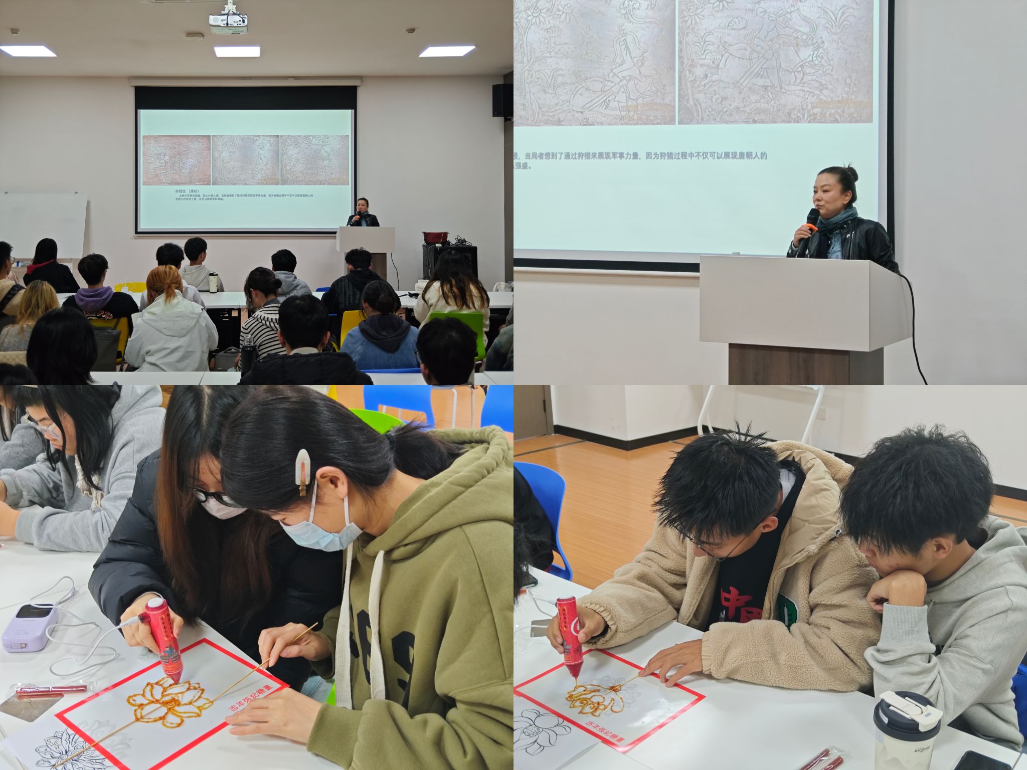 活动开始,李元老师通过多媒体展示,带领同学们深入了解了唐代装饰图案的美学特征和历史背景,并对唐代的典型纹饰、纹样进行了详尽的阐释。在糖画制作环节中,现场工作人员向同学们展示了已经完成的作品,并详细讲解了制作过程。同学们以“唐莲”图案为蓝本,创作出了一系列精美的作品。活动最后,同学们展示了自己制作的糖画作品,并分享了在学习与创作过程中的心得与体会。