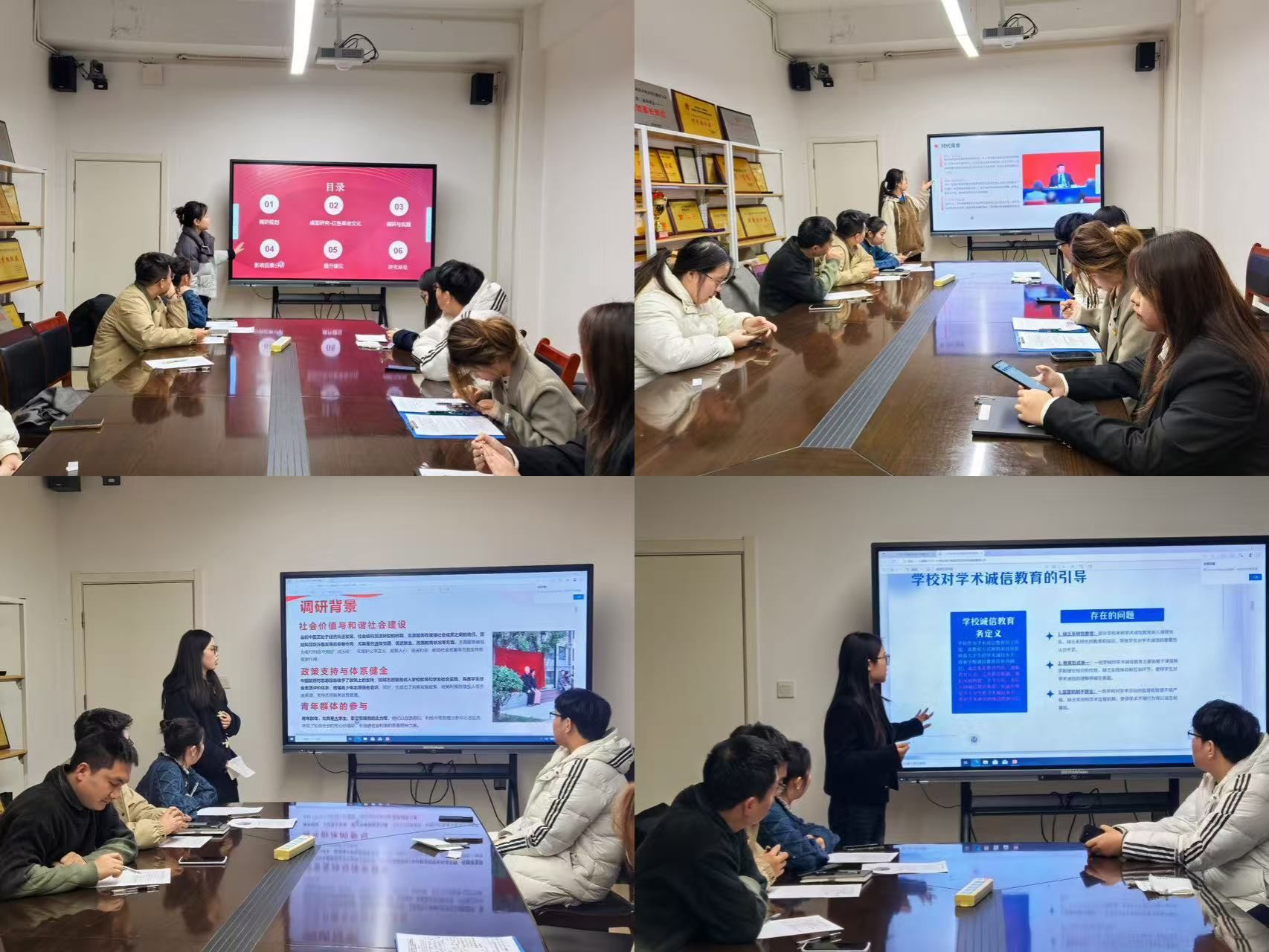 考核过程中,各小组代表依次通过精心制作的PPT向大家汇报交流了调研实践成果。调研内容包涵老员工对红色文化的了解、老员工学术诚信现状、志愿服务开展情况等多个方面。各小组通过问卷调查、数据分析等方式,对调研主题进行了深入细致的研究,不仅体现老员工入党积极分子敏锐的观察力,更体现了作为新时代青年的责任感和使命感。