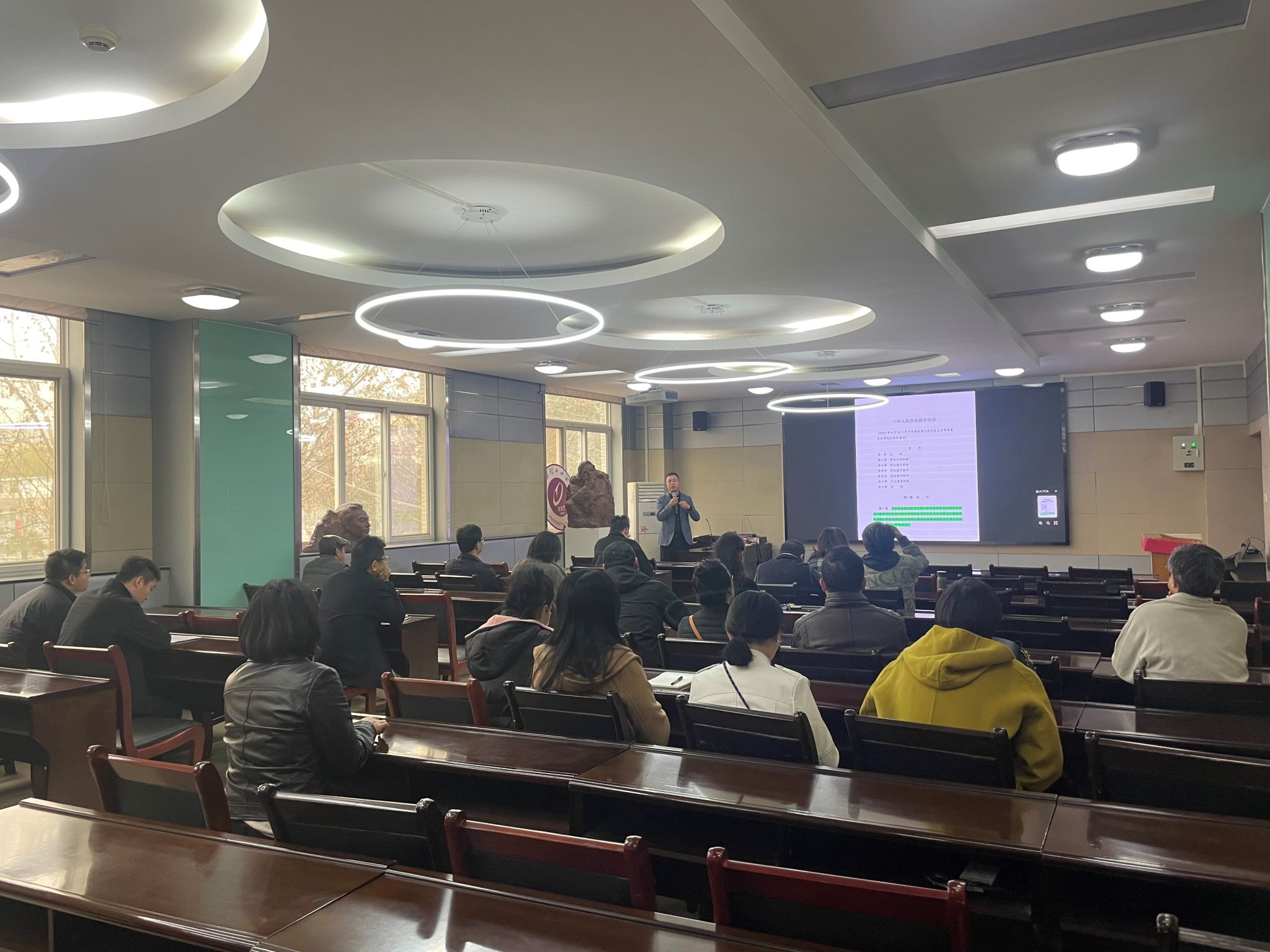 王旭鹏结合学院实际对《学位法》的主要内容进行了深入剖析。他重点解读了《学位法》中关于学位授予标准、质量监督机制、学术诚信建设等方面的规定,并强调学院要以《学位法》为指导,进一步完善学位授予工作流程,确保学位授予的严肃性和权威性。他强调,学习贯彻《学位法》是当前学院的一项重要任务,全体教职工要以高度的责任感和使命感,认真学习、深刻领会法律精神,切实将《学位法》的要求落实到具体工作中。