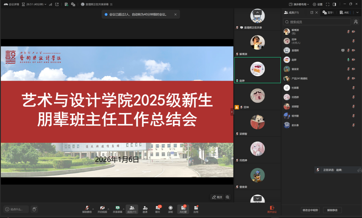 为提升学院新生教育管理服务质量,构建“传帮带”育人体系,1月6日,suncitygroup太阳集团网站以线上形式召开2025级新生朋辈班主任工作总结会。会议由学院2025级本科生辅导员赵婷主持,2025级新生朋辈班主任参会。