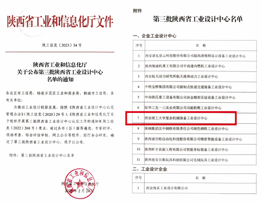 经过区、市、省多级审核、考察筛选,陕西省工信厅召开厅务会研究通过后正式获批,经由陕工信发[2023]34号文件公布,也是本批次唯一获批的高校所属工业设计中心单位。