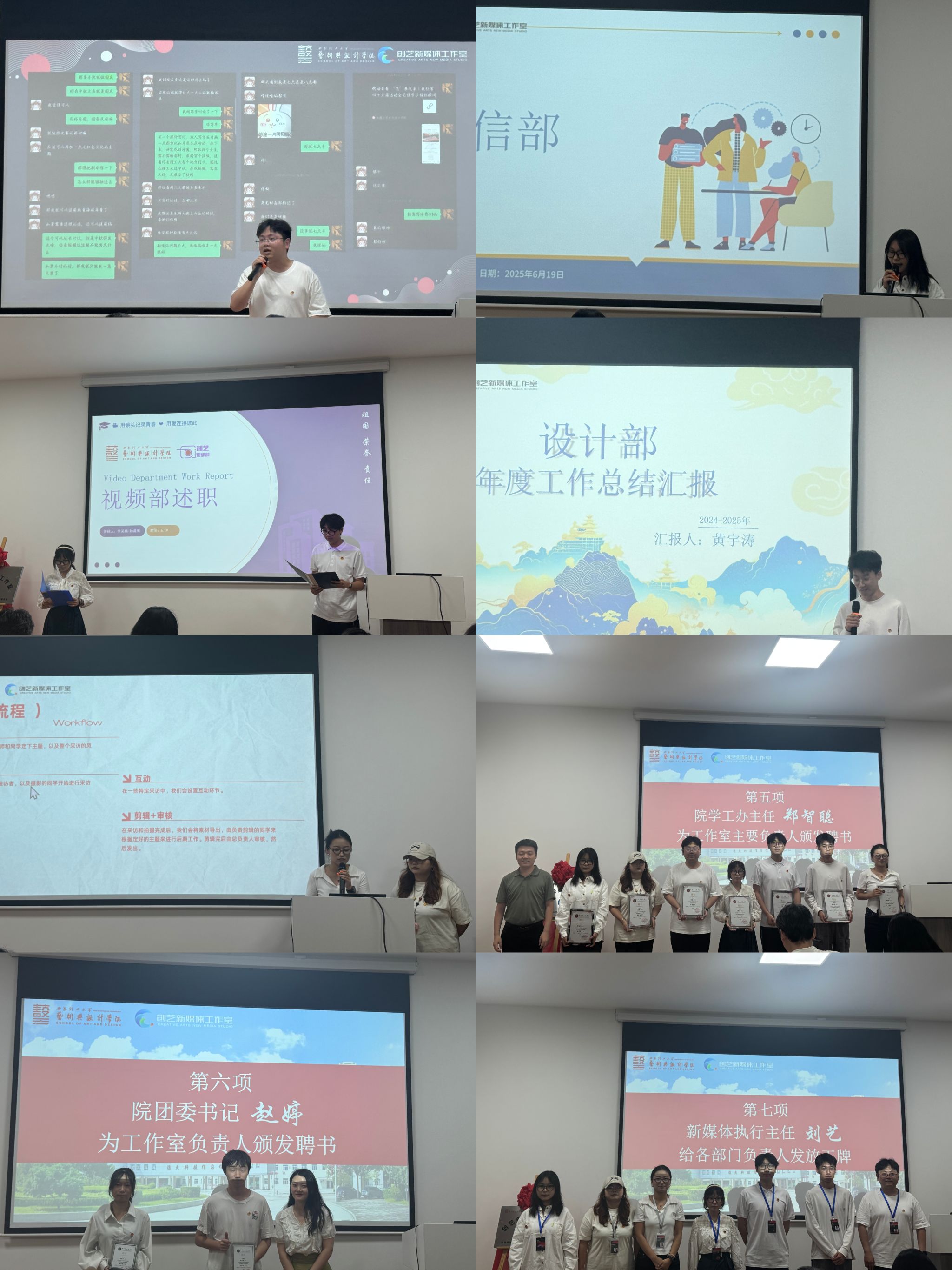 会上,工作室首届执行主任刘艺作工作总结报告,他全面回顾了过去一年中工作室在学院宣传工作中取得的显著成绩,并且从“我想、我来、我做”三个维度出发,对新加入的部门成员表达了激励与期望。各部门主要负责人分别从微信公众号运营、视频号运营、特色设计项目以及采访类视频专项等方面依次进行述职汇报;工作室新一届执行主任熊彬斌作就职发言,他表示将接过学院宣传重任,带领大家接续奋斗;此外,大会为上届工作室主要负责人、部门负责人颁发聘书,并给工作室全体成员发放工作牌。